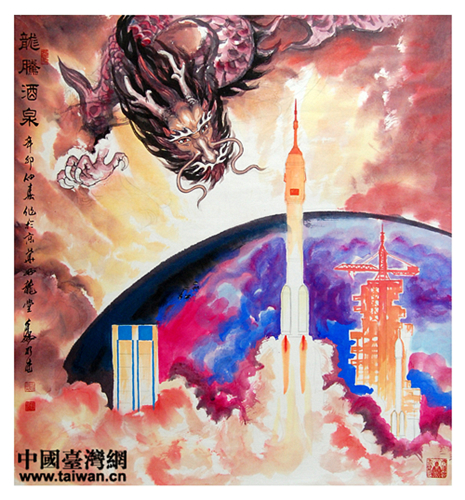 中国台湾网6月17日北京消息 北京时间6月11日17时38分,神舟十号载人飞船在酒泉卫星发射中心发射升空,准确进入预定轨道,顺利将3名航天员送入太空,这一刻令中华儿女感到自豪。然而,或许有人不知道,与神十一起升空的,还有著名书画家魏振武先生的红龙画作《华夏腾飞》。